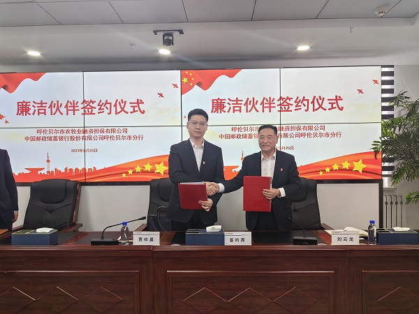 5月25日,呼倫貝爾市農(nóng)牧業(yè)融資擔(dān)保有限公司、中國(guó)郵政儲(chǔ)蓄銀行股份有限公司呼倫貝爾市分行《廉潔伙伴共建協(xié)議》簽署儀式在中國(guó)郵政儲(chǔ)蓄銀行股份有限公司呼倫貝爾市分行舉行。市農(nóng)擔(dān)公司黨委紀(jì)檢委員、副總經(jīng)理賈梓晨,黨委委員許叢友,郵儲(chǔ)銀行紀(jì)委書(shū)記、黨委委員、副行長(zhǎng)劉云龍,黨委委員、副行長(zhǎng)華哲及相關(guān)部門負(fù)責(zé)同志參加儀式。